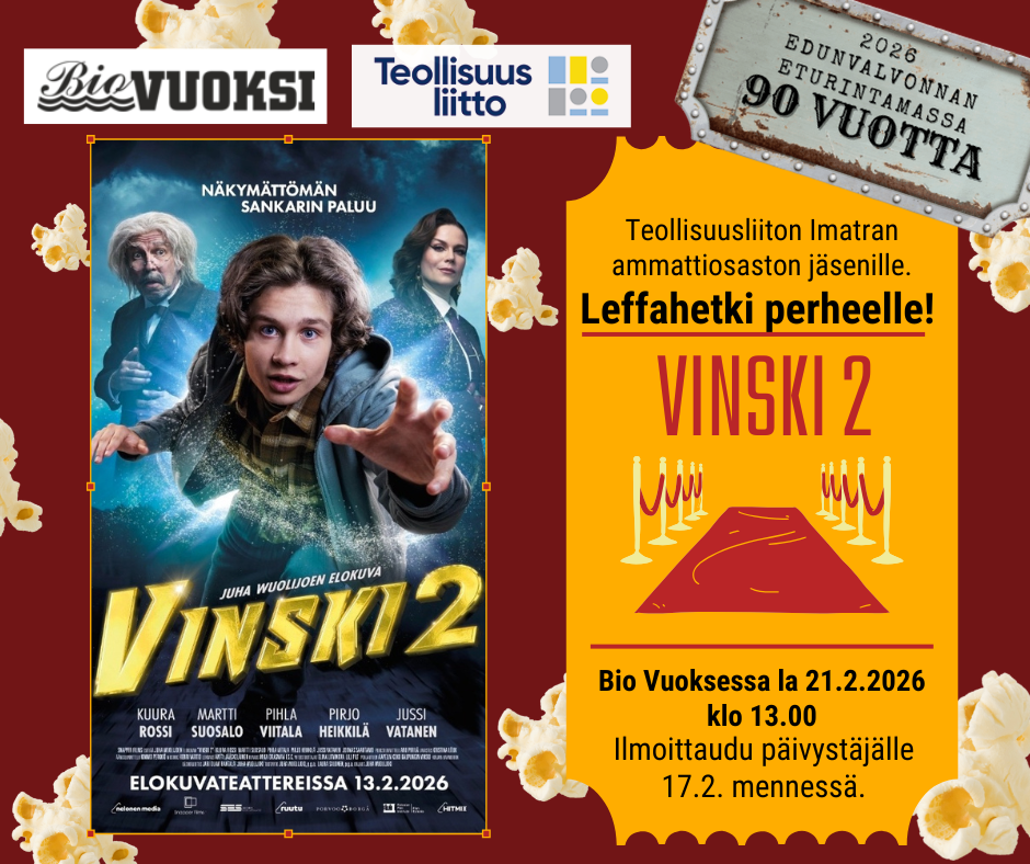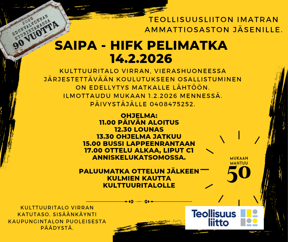 Teollisuusliiton Imatran ammattiosasto ry tarjoaa jäsenilleen: 14.2. koulutuspäivä kulttuuritalo Virran vierashuoneessa lounaan kera jonka jälkeen bussikuljetus Kisapuistoon sekä ottelu SaiPa-HIFK…