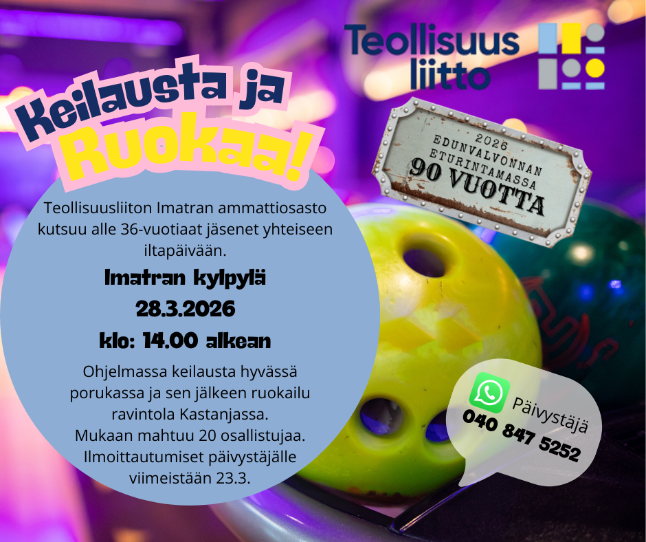Keilausta ja Ruokaa! 🎳🍽 Teollisuusliiton Imatran ammattiosaston alle 36-vuotiaille suunnattu iltapäivä starttaa la 28.3. klo 14 Imatran Kylpylällä. Ensin kaadetaan keilat, sitten siirrytään…